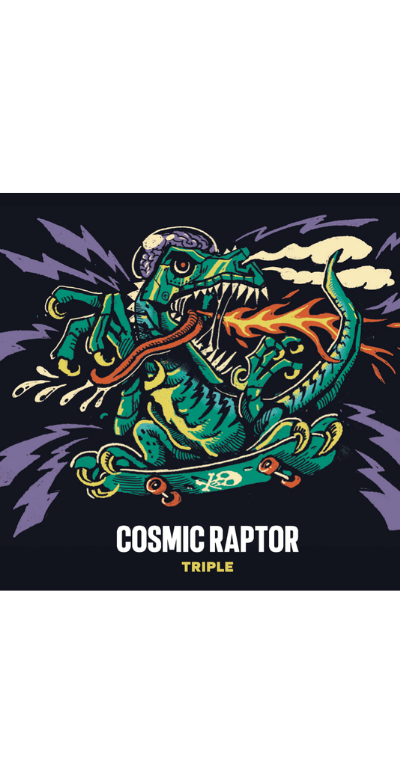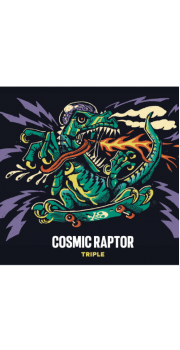 Cosmic Raptor est une bière puissante qui revisite le style des triples belges tout en conservant un profil sec et tendu. D’un bel aspect orangé et ambré, elle dévoile un nez gourmand partagé entre les céréales aux accents caramélisés et toastés et les notes épicées et estérisées typiques de la levure. En bouche, on retrouve cet équilibre entre les malts et les notes fermentaires soutenu par une fine amertume rafraîchissante. L’acolyte idéal pour votre prochain voyage jurassico-interstellaire.